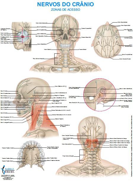 Este lindo poster desenhado por Jean-Pierre Barral e Alain Croibier lhe permite ver os nervos do crânio em detalhes vívidos. A ilustração em cores vívidas realça os nervos, seus pontos de saída pelo crânio e vértebras, assim como alguns músculos chave que eles perfuram.