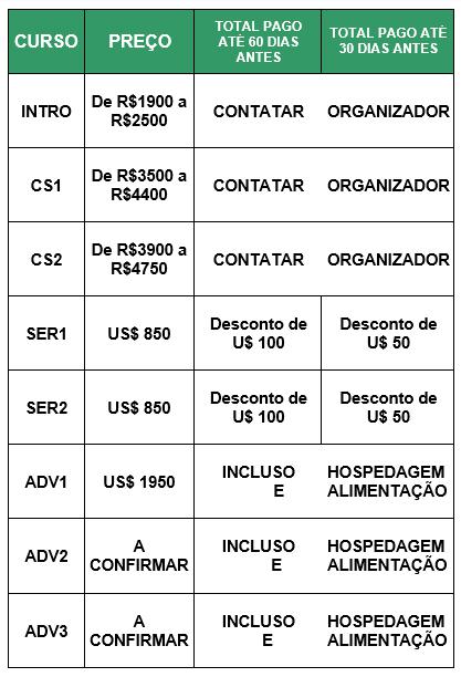 O pagamento dos cursos/eventos extracurriculares pode ser parcelado, contanto que o total esteja pago até o primeiro dia do curso. Pagamentos antecipados recebem descontos, como especificado na tabela.
